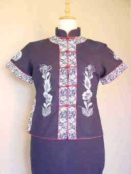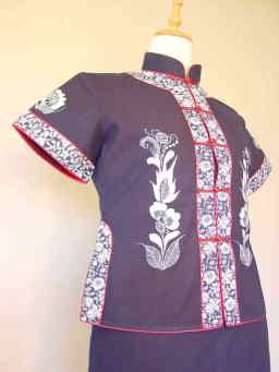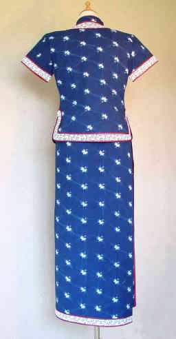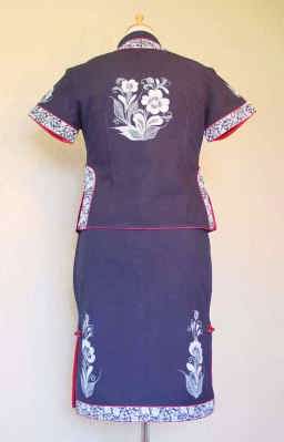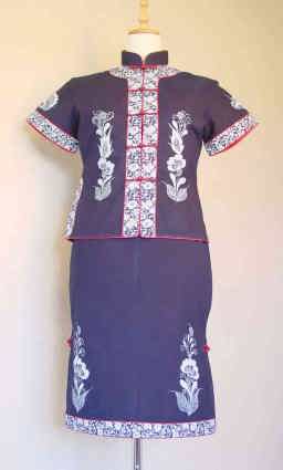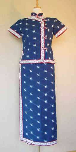| 濃いめの藍色で、ヒモボタンは一の字ボタンです。基本的にシックなデザインですが、真ん中と腕のラインがシックながらもキラッとした華やかさを演出します。 またスカートはチャイナドレスらしくスリットが入っています。スリットの付け根にはチョウチョタイプの赤いヒモボタンが付いていて、とても可愛いですよ。スカートのろうけつ染めものデザインもいいですね。胸前のボタン留めのあわせ部分は下に2cm程同色の生地が第五ボタン下(おへそ位置)まで着いており、合わせ部分から下着等が見えることはありません。ご安心を...。 |