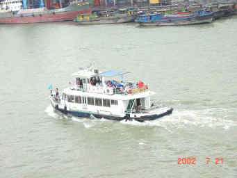 一艘の船で、物資を満載した二艘の船を曳航している船も多く見かけた。ビルや高速道路の建設のため、土砂はいくらあっても足りないのだろう。 |