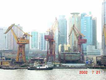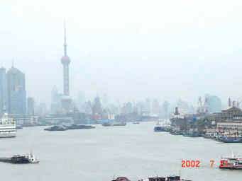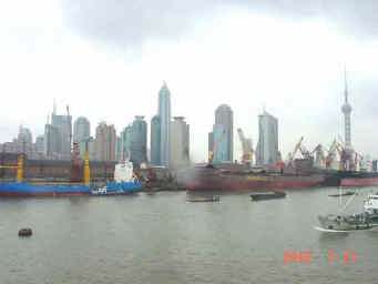 大きい船も、小さい船も大都会上海を目指して進む...。豊かな未来にむかって躍動する上海はもうとまらない。 |