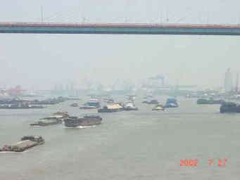 上海に近づくとこの大きな橋が見えてくる。 名前は忘れたけど、この橋をすぎて30分くらいすると港に到着となる。この橋が見える前から、海上とはまるで違うにおいがしてくる。 |