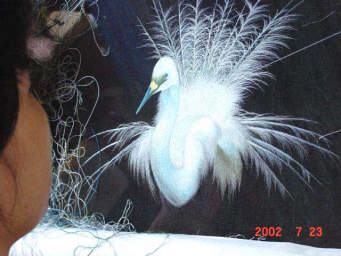 羽根の一本一本までも精巧に描写される。 まるで実物がそこにいて、今にも動き出しそう...。この白い鳥をここまで作製するのに約一ヶ月かかったとのこと。それでもまだ作成中で未完成...。
