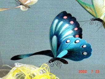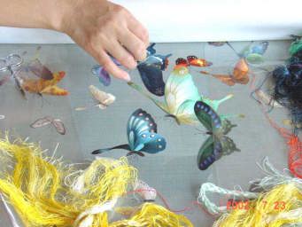 チョウチョの左下に刺繍糸が写っていますが、この糸をそのままの太さで使うことはなく、刺繍箇所にあわせて刺繍糸をほぐして適当な太さの糸(と言うか繊維。)を抜き出してから刺繍していく。
