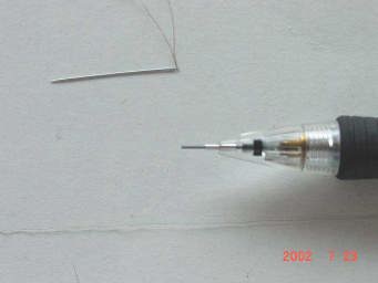 実際に使っている針と糸をアップで撮影しました。私の愛用の100円シャーペンと比べてください。芯よりも細い糸と、髪の毛よりもはるかに細い糸(糸?と言うか、殆どセンイ...。)で作られていました。脱帽!!!職人さんはこの撮影の時の糸を記念にくれました。今でも大事に今でも大事に名刺ホルダーに入れて保管していますが、いま改めて見てもホントに細いです。(測定器があったら髪の毛が何ミクロンで、糸は...戸か説明できますが、無いので、この程度の説明でスイマセン!)