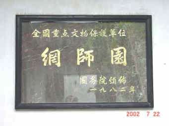 網師(もうし)とは漁師さんのこと。 18世紀に北宋期の蔵書家史正志が万巻堂を建てた。当時は漁隠と呼ばれていた。その後、官僚の宋宗元が邸宅として購入し、改築した。そして名前も網師と改名された。 1982年全国重点文物保護単位(重要文化財)に指定。 1997年12月4日に世界遺産のリストに入る。 総面積 5,000u(1,515坪) 入場料は15元(218円 2002年7月22日現在) |