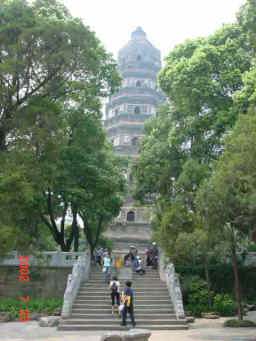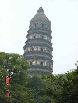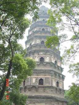 両隣の木と比べていただくと、塔が傾いているのが良く判っていただけると思います。この塔があるところは小高い山の頂で、この小山から蘇州の郊外の様子を望むことが出来る。 | |