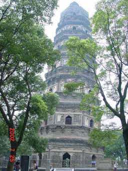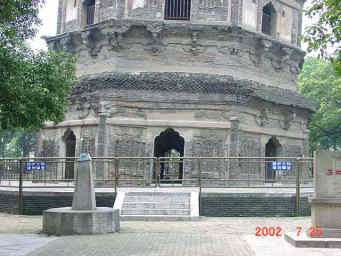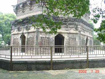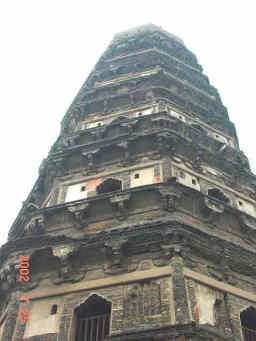これが有名な中国のピサの斜塔と呼ばれている雲岩寺塔。 400年前から地盤沈下のため傾き始め、現在は北に15度傾いている。塔の高さは47m。八角七層で、宋代961年に建てられたものです。 |