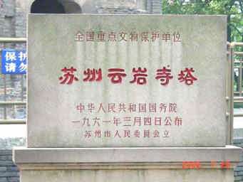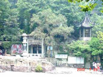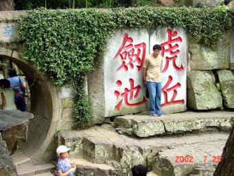 虎丘 ここは春秋時代に呉王夫差(ふさ)が呉王だった父親の闔閭(こうりょ)を埋葬したと言われている場所。父親の葬儀の三日後、白い虎が突如現れ、墓の上にうずくまって墓を守ったと伝えられている。このことから虎丘と呼ばれるようになった。主な史跡は試剣石、剣池、虎丘塔(雲岩寺塔)など。 総面積 200,000u(60,606坪) 入場券 25元(364円 2002年7月25日現在) |