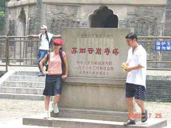 ポーズを決めて、はいチーズ! 唐代の大詩人・蘇東坡はこの虎丘を称えて”到蘇州不遊虎丘者、乃憾事也。”(蘇州に来て虎丘の観光をしなかったら、何とももったいないことだ。)と言わしめたとのこと。その言葉に従い(?)、郊外にあるにもかかわらず、毎日多くの観光客が訪れる。 |
