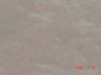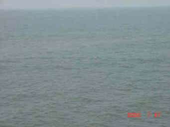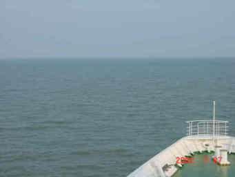 帰国時、アナウンスで長江と海が混ざり合うところにさしかかるとのこと。カメラを持って甲板に走り、カメラに納めました。 青い海の中に所々黄色いところがあるのがお判りになっていただけるでしょうか??? |