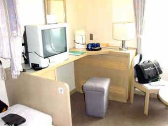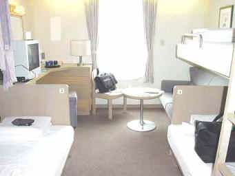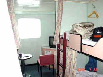新鑑真号の一等室の中です。4人部屋です。 TV、ソファー、ポット、洗面所があります。 室内にトイレ、シャワーはありませんでした。 |