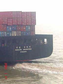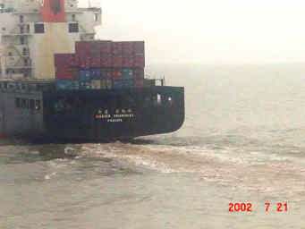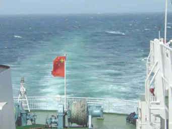多くの船とすれ違いますが。長江が近くなるに海の色がつれどんどん黄色くなります。多くの土砂で海底が浅くなり、船が通るとスクリューにかき回されてこの写真のようになります。 | |