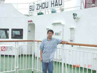 青い海、青い空。青い海に消えゆく航跡...。 第一回出張は優雅(?)に船で行きました。大阪国際フェリーターミナルから豪華フェリー・蘇州号(SUZHOU HAO)に乗り、一路上海へ。今回は51時間かかりました。 蘇州号 プロフィール 総トン数 : 14,410トン 全長 : 154.73m 全幅 :22.0m エンジン : 8,400馬力 x 2基 航海速力 : 21ノット(約38.9km/h) |