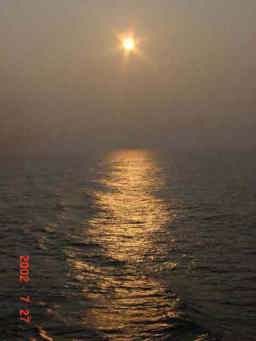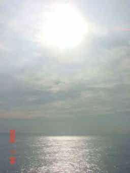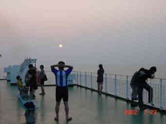 日没間近の太陽です。 青い海に沈む夕日はとてもうつくしく、見る人を感動させてくれます。こんな光景はなかなか見れないから見とれてしまいました。夕焼けを見る為、沢山の人が甲板に来ていました。 |