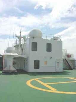 甲板は歩き回れる。 ここに“H”と書かれているところを見るとヘリコプターも着陸できるのだろう。 |
