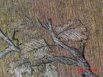 これは上の山水画で、樹木の葉の部分の超ドアップ(4cmくらいの接写。)葉っぱや幹が極細の糸で丁寧に刺繍されているのがわかる。ちなみにこの葉っぱ、長さはたったの1cm程、この葉っぱ一枚でも午前中いっぱいかかるそうです。上の作品が3ヶ月かかるのもうなずける。 | |