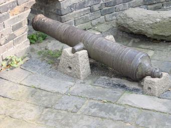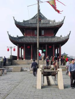 城壁上の楼閣。 ここから敵の侵入を監視していたのだろう。 右の方に何か台のようなものがありますが、これには水上からきた船や水量を管理・調節する水門を上下させる鎖を巻いている。 |
