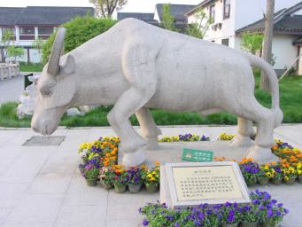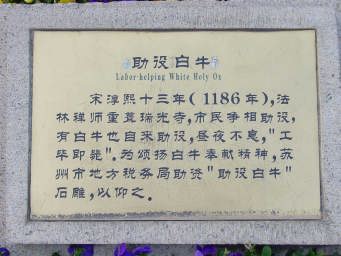 栄熙十三年(1186年)法林禅師が瑞光寺を再建する際、市民は争うように建設を助けた。そのとき白牛が自らやってきて昼夜を問わず工事を助け、工事が完了するとすぐに死んでしまった。蘇州市地方税務局は白牛の奉献精神を広く世に知らしめる為に資金援助をし“助設白牛”の石像を建ててこの牛の働きをたたえた。 |