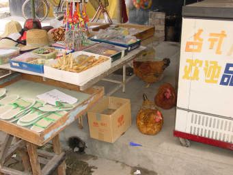 雑貨屋をのぞくと、まるまる太ったニワトリさんがいました。 豊かな土地はニワトリも肥え太るんだね。 |