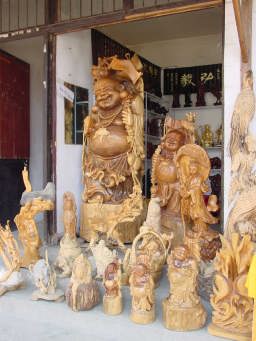 木彫りのお店。 表情がユーモラスですね。 |