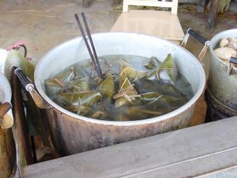 こちらはちまき。 中は五目御飯みたいな感じ。 昔、留学中に食べたけど、運悪く、古くなっているのを買ったことがある。それ以来、買ったことがない。 |