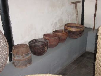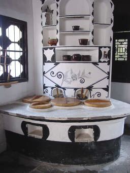 こちらはキッチンです。下からわらや薪を入れて調理します。 絵なんか描いてあって、なかなかおしゃれ。 |