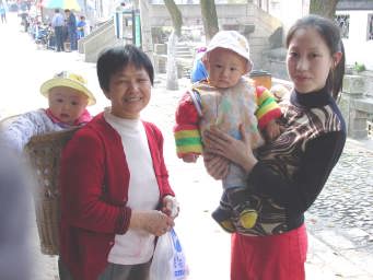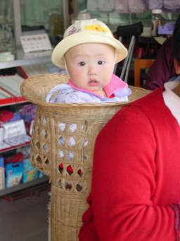チャイナベイビー。 おばあちゃんの担いだカゴに入れられてラクチンだね! |
