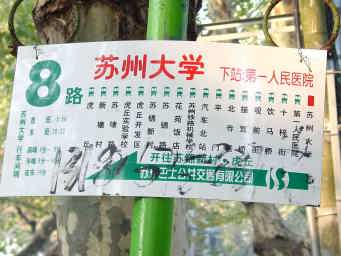 バス標識。 路線番号は8路 このバスストップが蘇州大学 進行方向が矢印で示され、停車駅が全て書かれている。 時刻表はない。時間帯により6分から15分間隔と書かれている。 |