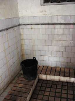 こちら大の専用ブース。 ここにおしり丸出しでしゃがんで用を足す。扉は見てのとおりない! 外国人はかなり勇気がいる。その上ニオイもかなりのモノで、前任者のがたいがいこんもり残っている。紙な無論ない。通常新聞紙を使っている。水は定期的にスゴイ勢いで流れてくる。気を付けないとオツリをもらうこともあるそうだ。 教訓...大はホテルで済ましましょう! |