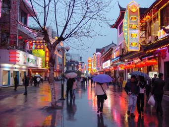 蘇州で一番にぎやかなところ−観前街 デパートや各種ショップ、レストラン、ファミレス、映画館、喫茶店イロイロあって蘇州っ子の人気スポットです。この日は小雨の夕暮れ。空気中のホコリもなくなり、ネオンがきれいだったので撮影しました。 |