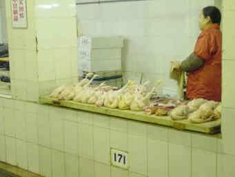 こちらは鶏肉売り場。 毛をむしっただけの状態で販売されている。 |