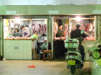 これは食品市場のお肉屋さん。 日本みたいにパックでは売られていない。 原型がつり下げられて切り売りしている。 |