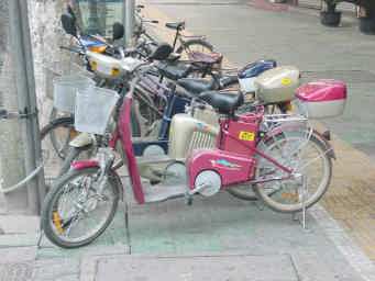 こちら今中国で大ブレークの電気自転車。 日本にもあるけど、クルマがまだまだ高嶺の花で買えない分、これに乗っている人を街中で見かける。新しもの好きの中国人。将来自転車はなくなり、こればかりになるのかな? |