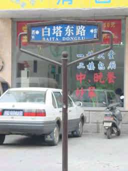 交差点付近でよく見かける道路標識。 この標識は白塔東路がこの通りであると示している。 |