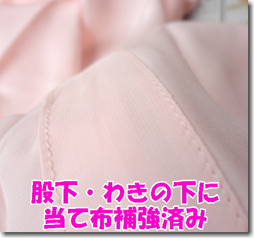 ![]() E当て布補強済み♪ シルクパジャマには弱点があります。 それは股下、お尻、そして、まれに脇の下が 破れたりほつれたりします。それを回避するため、 『ダブルステッチ』 + 『当て布』で二重補強ッ!! 少しでも長く愛用して頂ける様、知恵を絞りました。 |