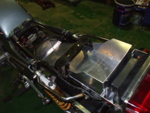 | 今頃、CB750Fの小物入れつきフェンダーレスキットを作ってみたよ。 ノーマルの18インチでは当たりそうですけど… ははは…。 小さいカッパぐらい入れられるようにとのご要望で製作しました。 バッテリーケースの後ろ(三角部分)をBOX状に、シートカウルの内側をコの字形にしているので 「M・G・W」さんところのクイックシートキャッチと併用する事で 中身の出し入れも楽に出来ると思います。 現在、製品化に向けて水面下で進行中! 2008/11製作 シートキャッチについては、店主でも作れないことないのですが、 アイデア商品的なものは、コピーするのは楽でも 作るのは大変な事というのが身に染みて分かっていますので 支障がない限り「MGW」の製品を使用する予定です。 |