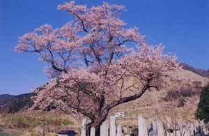 海津のまちはずれの墓地の中に一本大きくそびえ、樹齢300年以上といわれる巨桜は、"エドヒガンザクラ"という種類の桜で、滋賀県自然記念物にも指定されている県下最大級の桜です。