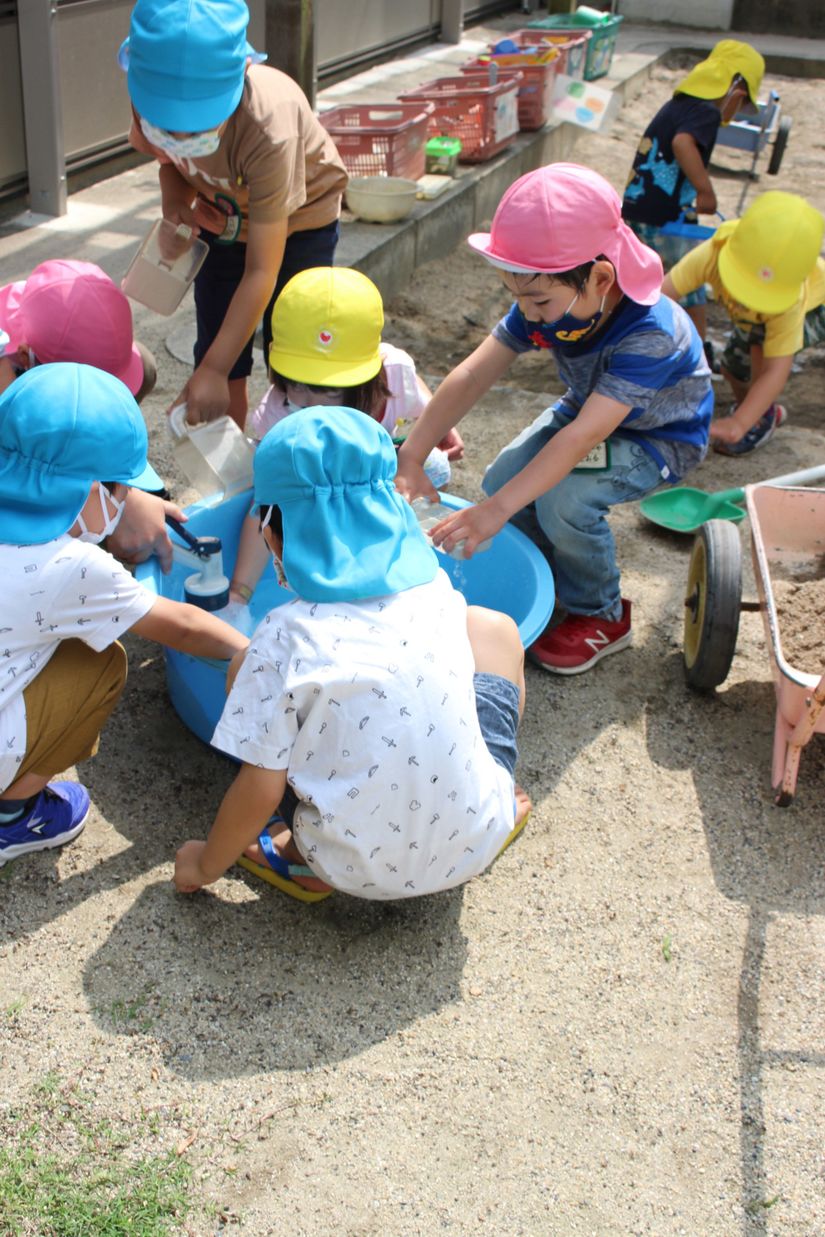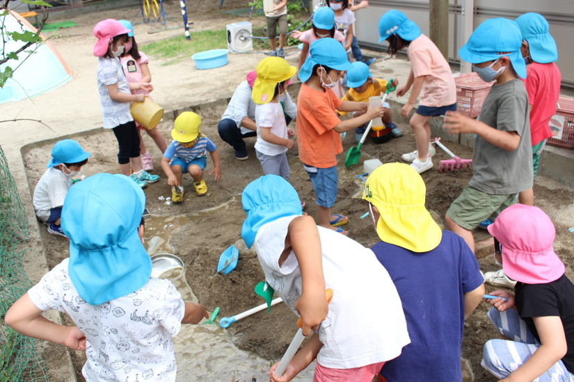 新型コロナウイルス感染症の緊急事態宣言が解除され6月1日より幼稚園が再開しました。今日は、とても良いお天気で子どもたちは、お水を砂場に運んで川作りをしていました。「お水冷たくて気持ちいい(*^^*)」と水遊びも楽しみながらお友だちと夢中で遊んでいました。