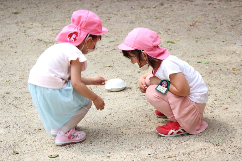 今日も、とても良いお天気で、子どもたちはお外でのびのびと遊びました。虫が大好きな子どもたちは、虫探しをしていました。あり、ダンゴ虫、ナメクジ、ミミズなどを見つけては、「アリさんをいっぱい集めたよ。」「ダンゴ虫、持てるようになったよ!」と見せてくれました。