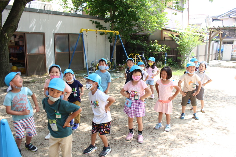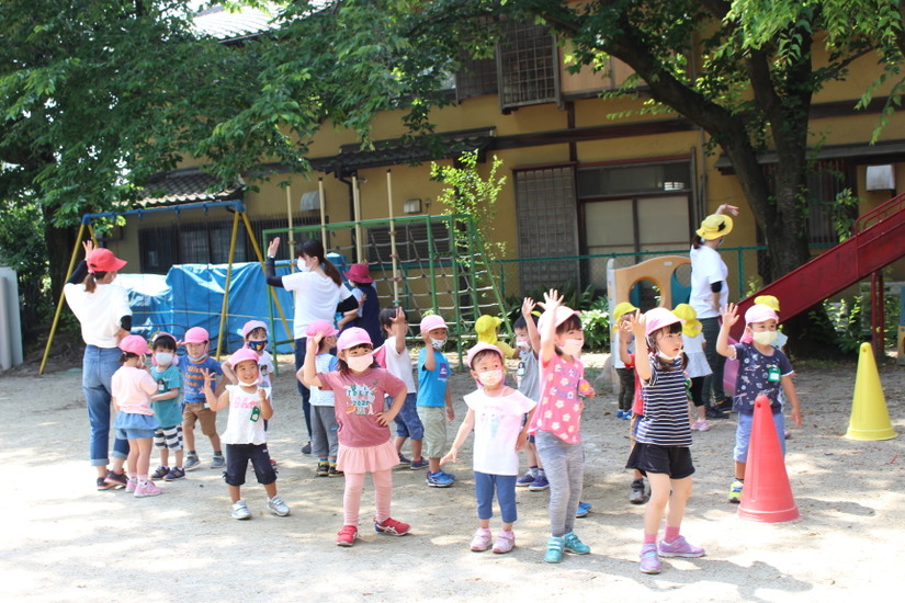 新学期になって、はじめて体操をしました。今日も暑い日でしたので、桜と欅の木陰ですることにしました。今日は、みんなが大好きなアンパンマン体操をしました。ノリノリで、張り切ってしていました。たんぽぽさんも、お兄さん、お姉さんを見ながらしていましたよ(^^)/