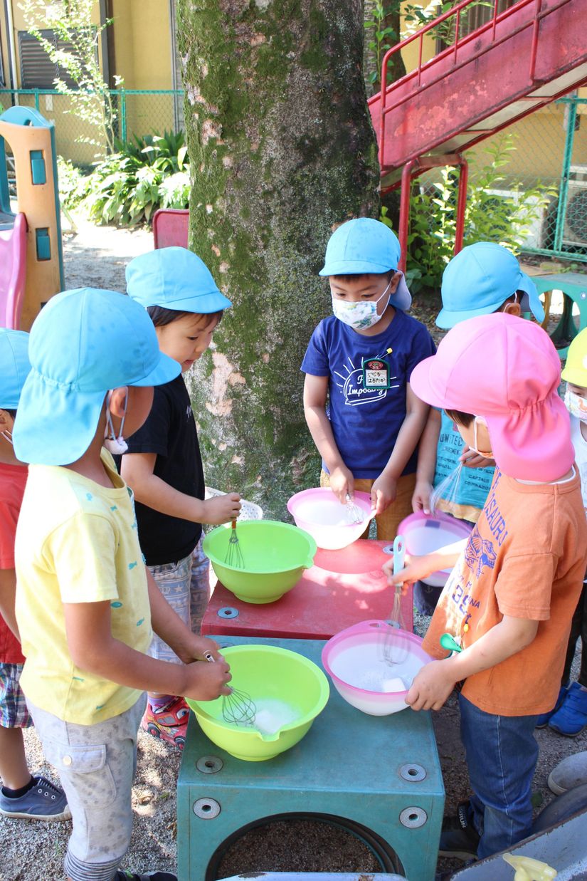 今日も、暑い日でしたので朝の自由遊びの時は、お水遊びやせっけんを泡立てて遊びました。おろし器でせっけんを細かくして泡だて器で泡立てたらあわあわになり大喜びでした。