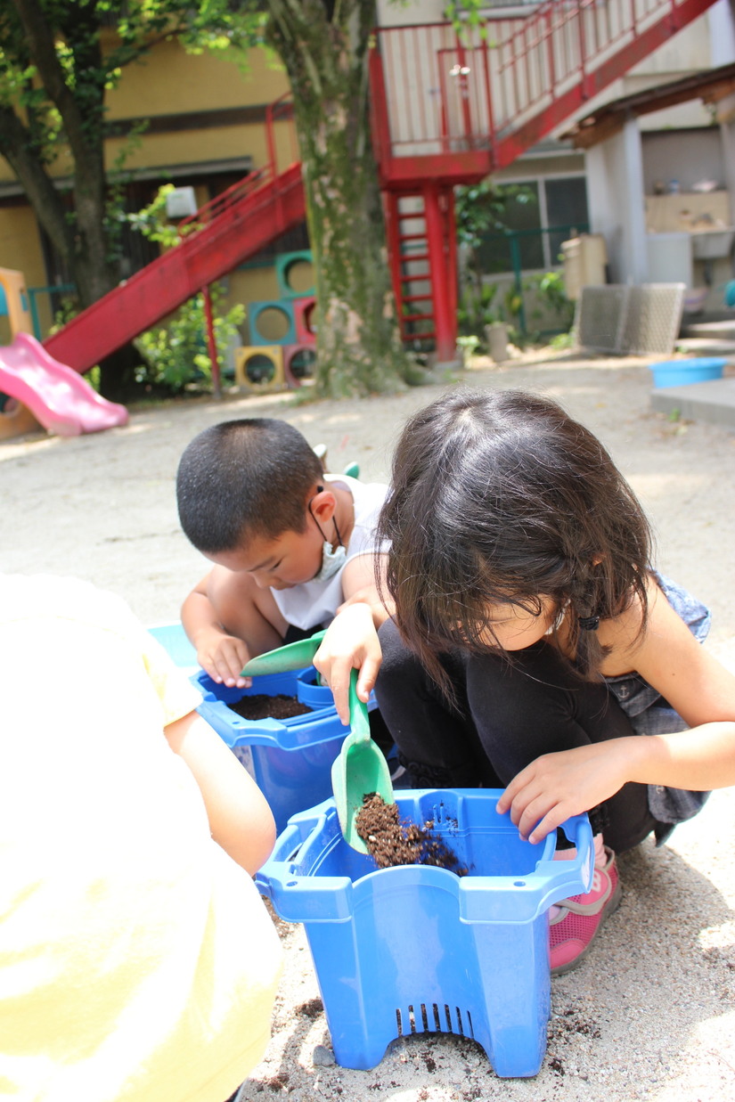 今年は、すみれさんは「ひまわり」 れんげさんは「あさがお」 たんぽぽさんは「枝豆」を育てます。一人ずつ、すみれさん、れんげさんは、植木鉢に、たんぽぽさんは、牛乳パックに、土を入れてから種をまきました。「大きくなあれ(^^)/」と心を込めてことばをかけたので、きっとすくすくと成長すると思います。毎日、観察するのが楽しみになることでしょう(*^^*)