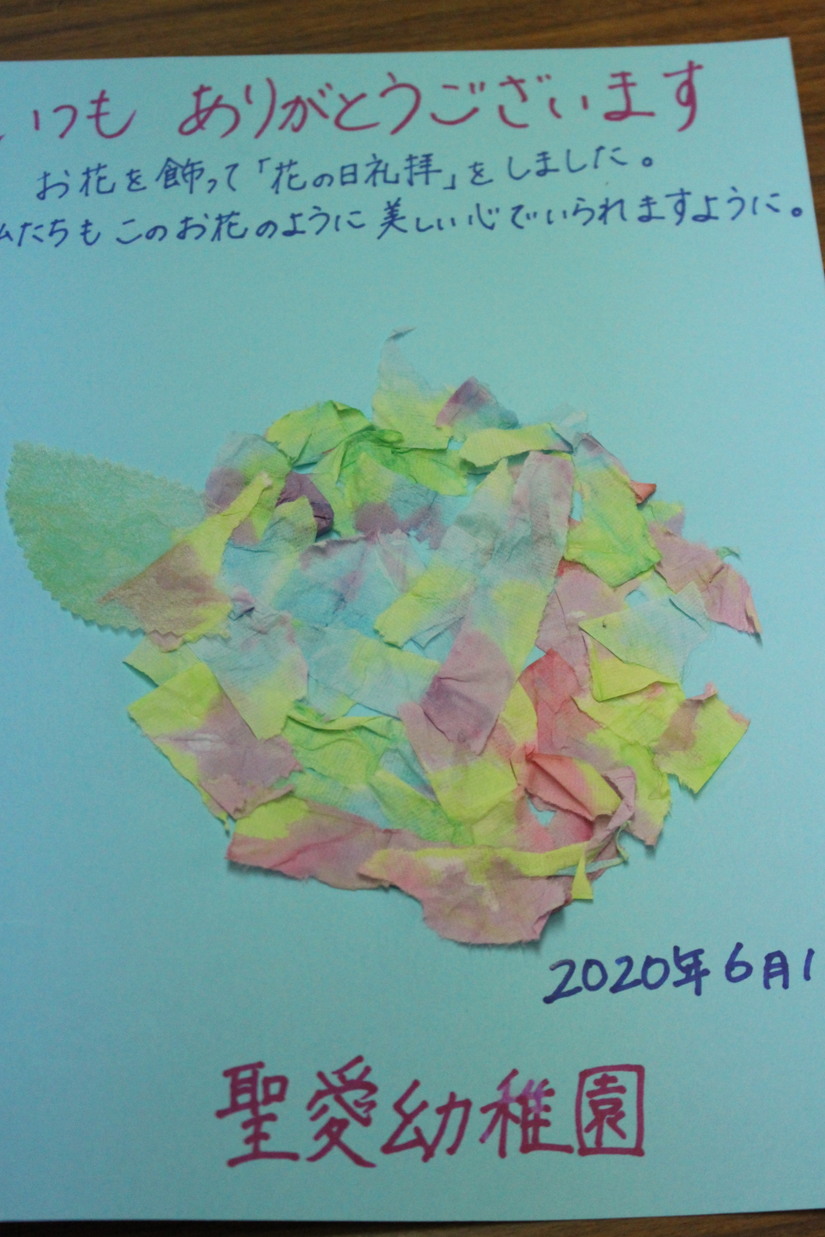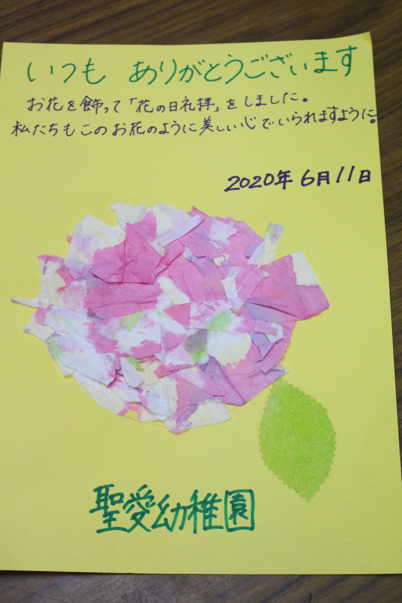 みんなで、お花を持ち寄ってホールの舞台に飾りお礼拝をします。「この花のように、みんなを和ませる人になりますように。」「優しい人になりますように。」と祈ります。礼拝後は、いつもお世話になっている方に花束をお届けに行きます。今年は子どもたちは訪問できませんので、保育者が届けます。園医さん、学校薬剤師さん、膳所市民センター、生涯学習センター、膳所本町郵便局さんなどへ感謝の気持ちを届けたいと思います。花束と一緒に、すみれさんが作った、カードもお届けしたいと思います。半紙を染め紙してきれいなお花にしました。