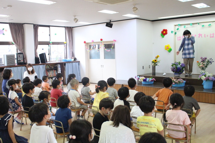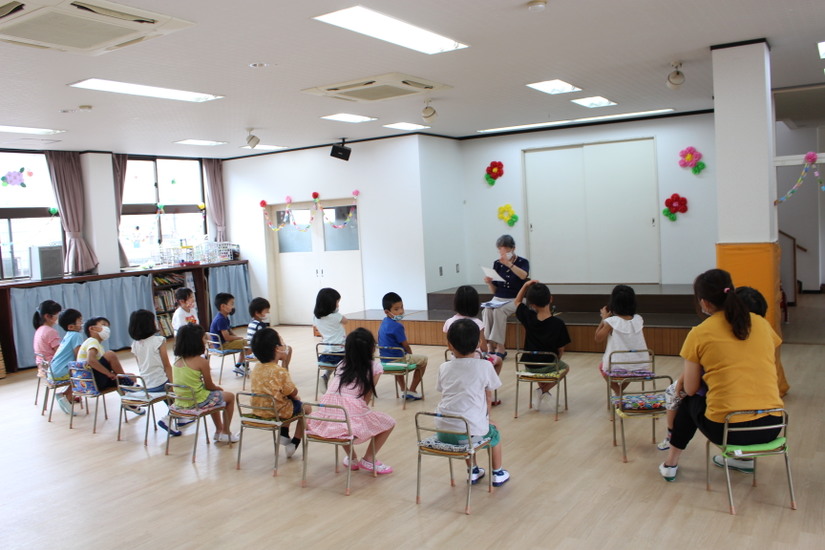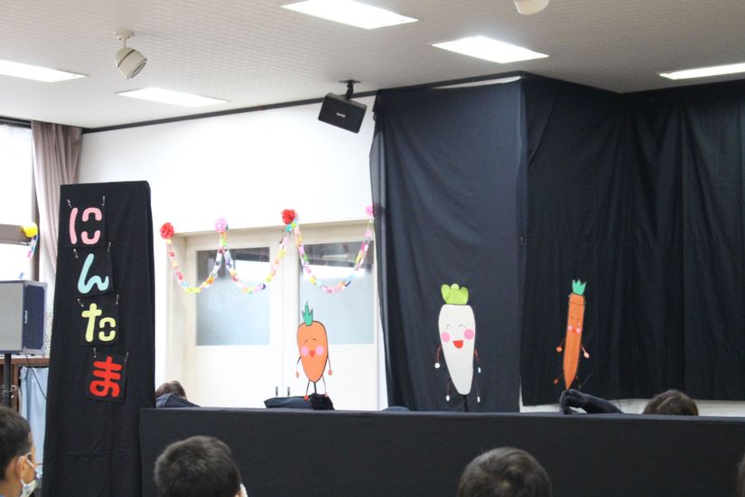 今日は、4.5.6月に生まれたお友だちのお誕生日会でした。6人のお誕生日のお友だちのお母さんも一緒にお礼拝をしてから、お誕生日会が始まりました。みんなに、お祝いをしてもらいとっても嬉しそうでした。今日の出し物は、人形劇「にんたま」さんが「人参・大根・ごぼう」のペープサートと、「どうぞのいす」の人形劇をしてくださいました。とっても楽しかったようで、お部屋に戻ってからも、人形劇のお話をしていました(*^^*)「にんたま」のみなさん、ありがとうございました♪