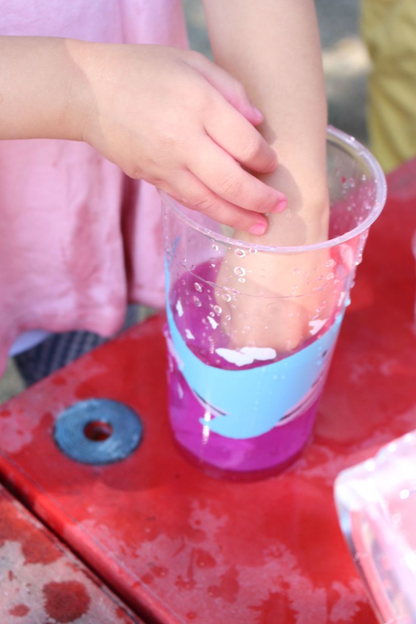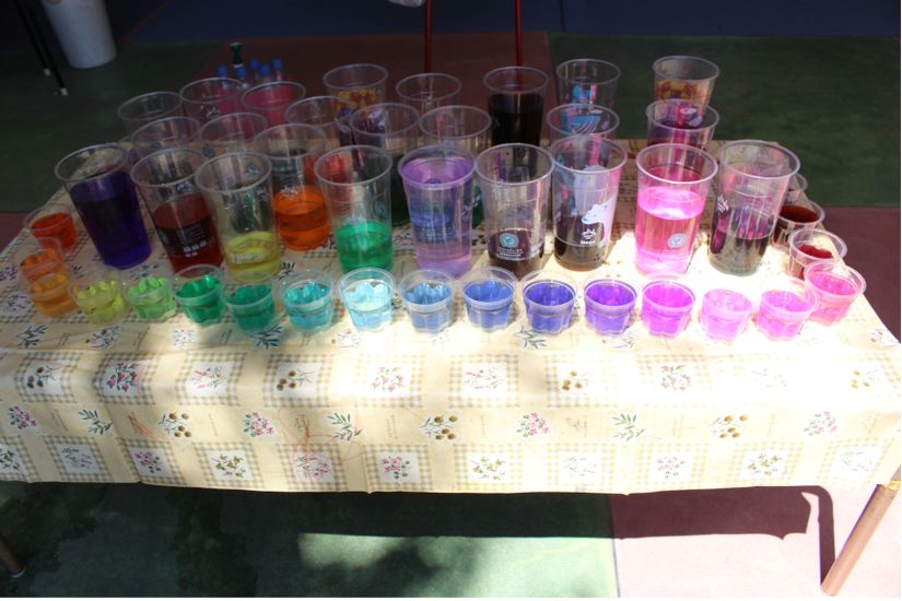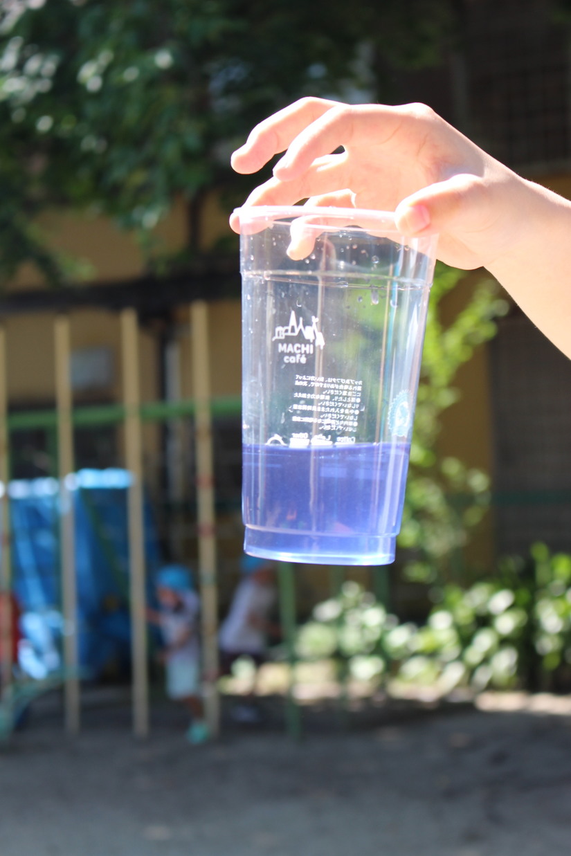 今日は、クレープ紙を使って色水を作りました。クレープ紙とお水をカップに入れて手で揉んだら、きれいな色水ができ、子どもたちは、「いちごのジュースができたよ🍓」「私は、オレンジ🍊」「グレープ🍇」「色々混ぜたら、コーラになった!」などなど、とても楽しんでいました。おいしそうなジュースがたくさんできました(^^♪