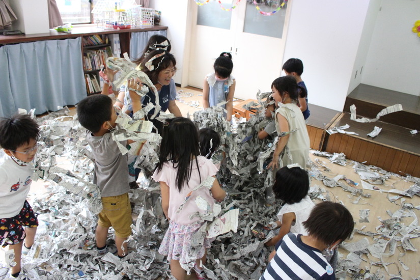 今日は、ホールで、新聞遊びをしました。先生が広げた新聞をパンチして破ったり、破った新聞を高く投げたり、新聞を体にかけてかくれんぼしたり、とても楽しく、身も心も発散して遊びました。破った新聞は、一人ずつ、ビニール袋に入れてゴムをつけ、ヨーヨーのようにして遊びました。