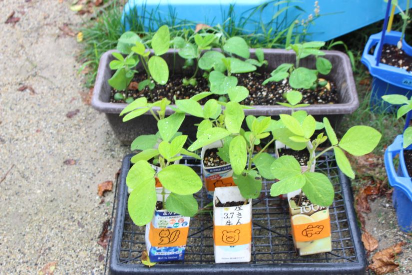 すみれさんは、「ひまわり」、れんげさんは、「あさがお」たんぽぽさんは、「大豆」を育てていますが、すくすくと、成長しています。あさがおは、つるも伸び、ひまわりは、茎がしっかりして、大豆は、葉っぱが大きくなってきて、子どもたちは、とっても嬉しそうです。来週、お家に持って帰りますが、お花が咲き、枝豆ができるともっと喜びが増すことでしょう!